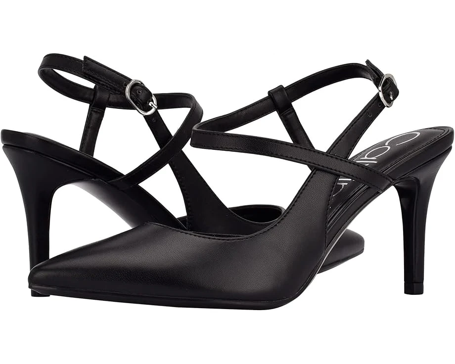 Add a sleek and sophisticated touch to your everyday outfit wearing the Calvin Klein® Gaella featuring an asymmetrical thin strap.SKU: #9700268Leather upper and Man-made lining.Asymmetrical thin strap around the ankle with an adjustable buckle. Pointed toe.Slim, tapered heels.Man-made outsole.Imported.Measurements: