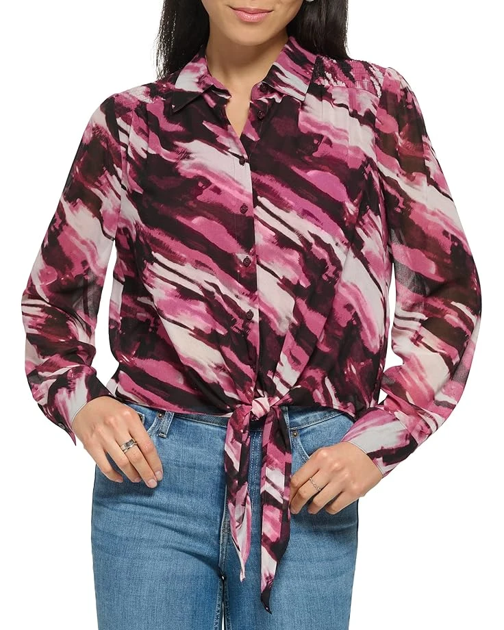 Accentuate your looks with the stylish and colorful Calvin Klein® Print Knot Front with Collar top.SKU: #9862886Folded collar.Long sleeves with button cuffs.Center front button closure.Rounded hemline with tie-knot design on front.50% polyester, 50% reprocessed polyester.