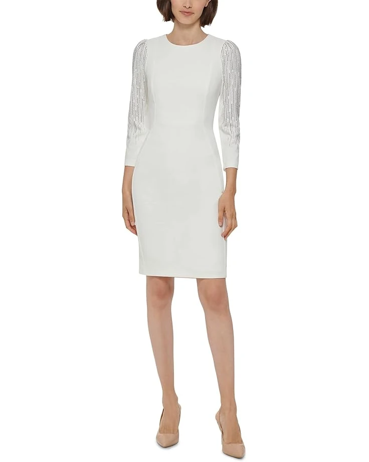 Get ready to feel the crafted comfort wearing Calvin Klein® Scuba Crepe Sheath with Beaded 3/4 Sleeves dress.SKU: #9851351Tight fit.Crew neck.Quarter printed sleeves.Center-back zipper closure.Above-knee length.94% polyester, 6% spandex.Machine wash.Imported.Product measurements were taken using size 4. Please note that measurements may vary by size.Measurements: