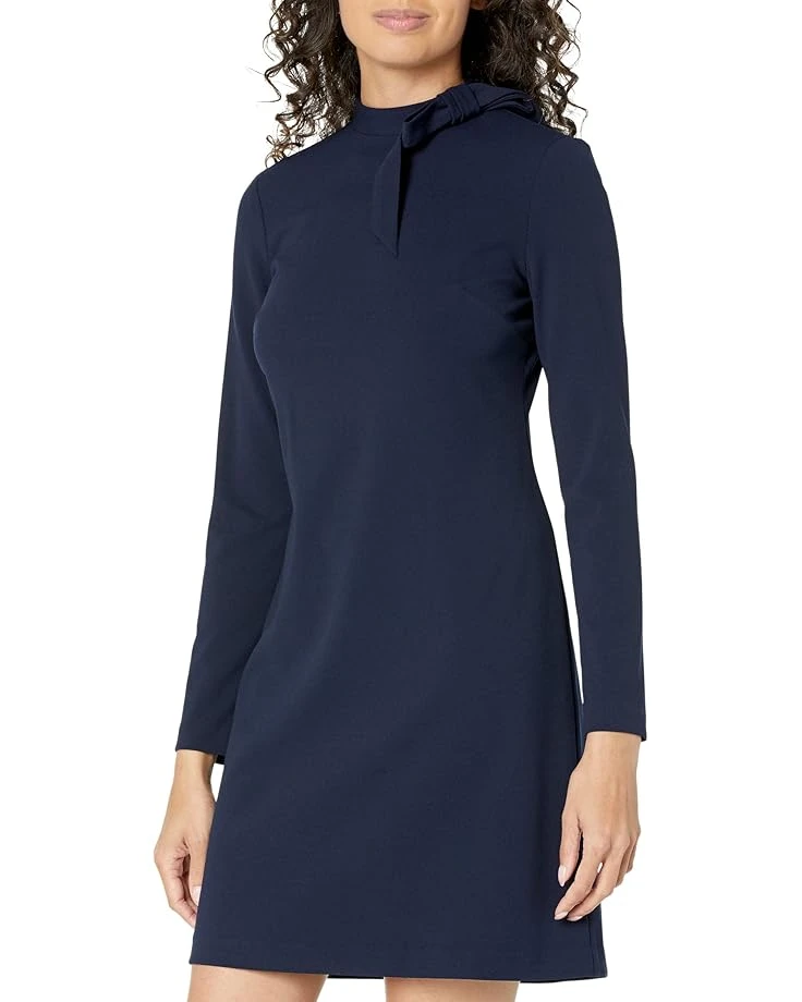 Perfect for instant day-out plans, the Calvin Klein® Scuba Crepe Tie-Neck Shift Dress features a classic bow-detailed accent on the neckline.SKU: #9875428Sheath silhouette.High neckline with bow tie detail.Long sleeves.Center back zippered closure.Hits above the knee.Straight hem.65% polyester, 30% reprocessed polyester, 5% spandex.Dry-clean.Imported.Product measurements were taken using size 4. Please note that measurements may vary by size.Measurements: