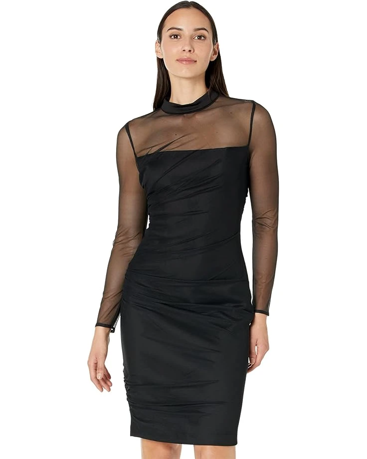 Calvin Klein® Scuba Dress with Mash Overlay Dress.SKU: #9851365Slim fit.Designed to hit near the knee. Illusion, mock neckline and long sleeves.Ruching on one side.Zippered closure on the center back.91% polyester, 9% spandex.Dry-clean.Imported.Measurements: