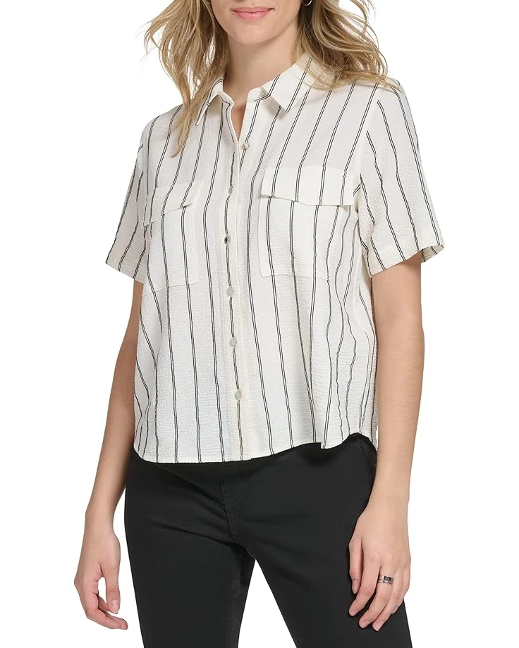 Accentuate your looks with the stylish Calvin Klein® Short Sleeve Button Front.SKU: #9886493Folded collar.Short sleeves.Center front button closure.Corner chest front flap patch pockets.Stripe pattern design.Straight cropped hemline.52% polyester, 46% rayon, 2% spandex.Machine wash, line dry.Imported.