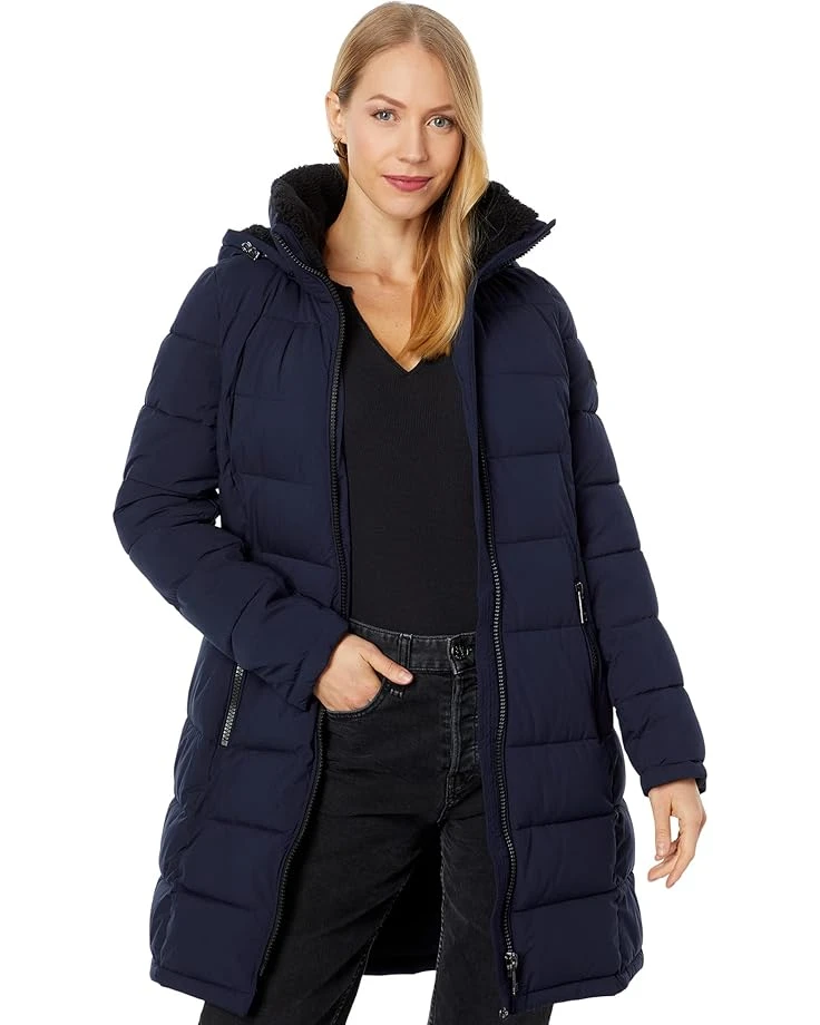 A versatile layer that keeps you warm during the chilly weather, the Calvin Klein® Stretch Walker Puffer Jacket features a stand collar with an attached hood keeping her protected at all times. SKU: #9850638Quilted construction.Attached faux fur lined hood and long sleeves.Brand patch detailing on the sleeve.Zippered front closure.Zippered pockets on the side.Intended to hit at the thighs.Straight hemline.100% polyester;